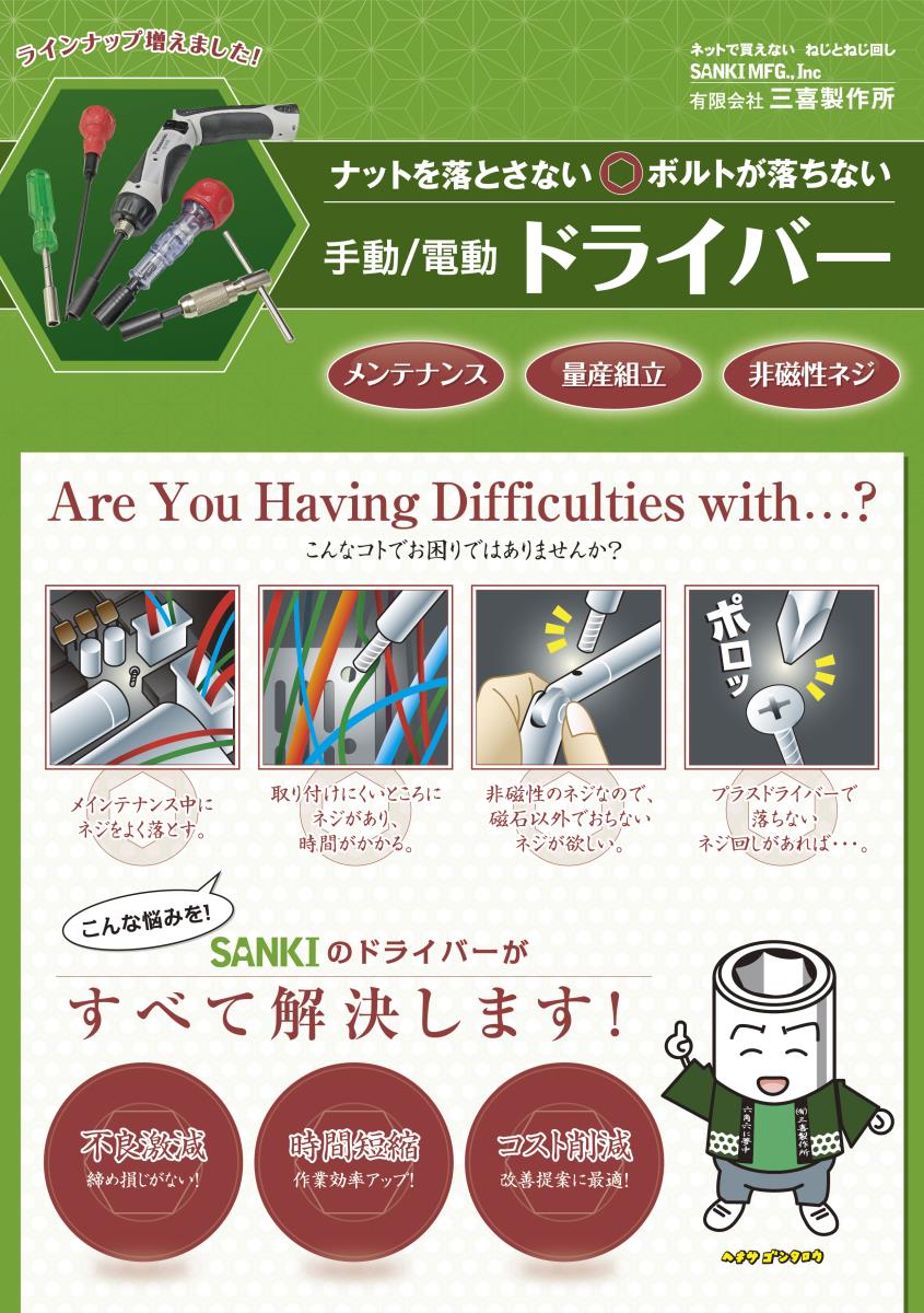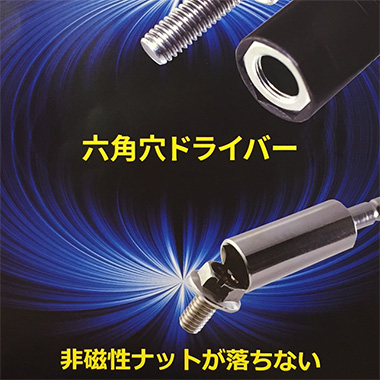 六角ボルトを磁石やバネを使用せずに、締め付け作業時に使用できる六角穴付ドライバー。手回し用と電動ドライバー用。
