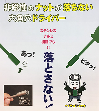 六角ボルトを磁石やバネを使用せずに、締め付け作業時に使用できる六角穴付ドライバー。手回し用と電動ドライバー用。